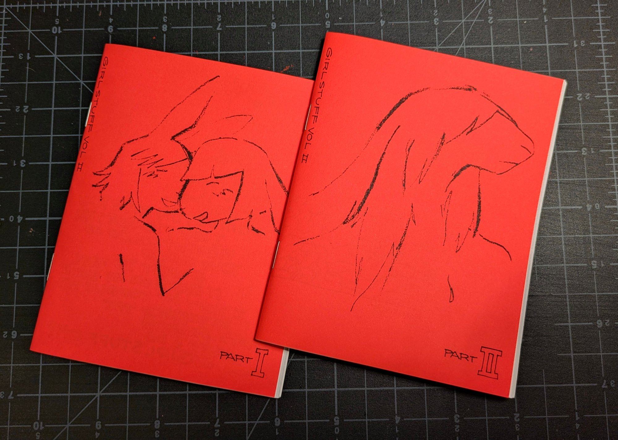 'GIRL STUFF VOL. 2' is a heartwarming romantic comedy about lesbians moving in together. and touching each other's intestines. Comprises 84 pages of sequential black-and-white artwork across two booklets. Includes fun surprises.